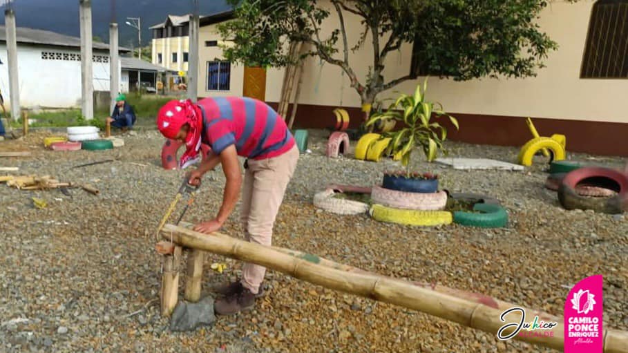 , instalaciones que cuentan con bancos y juegos infantiles con material reciclable