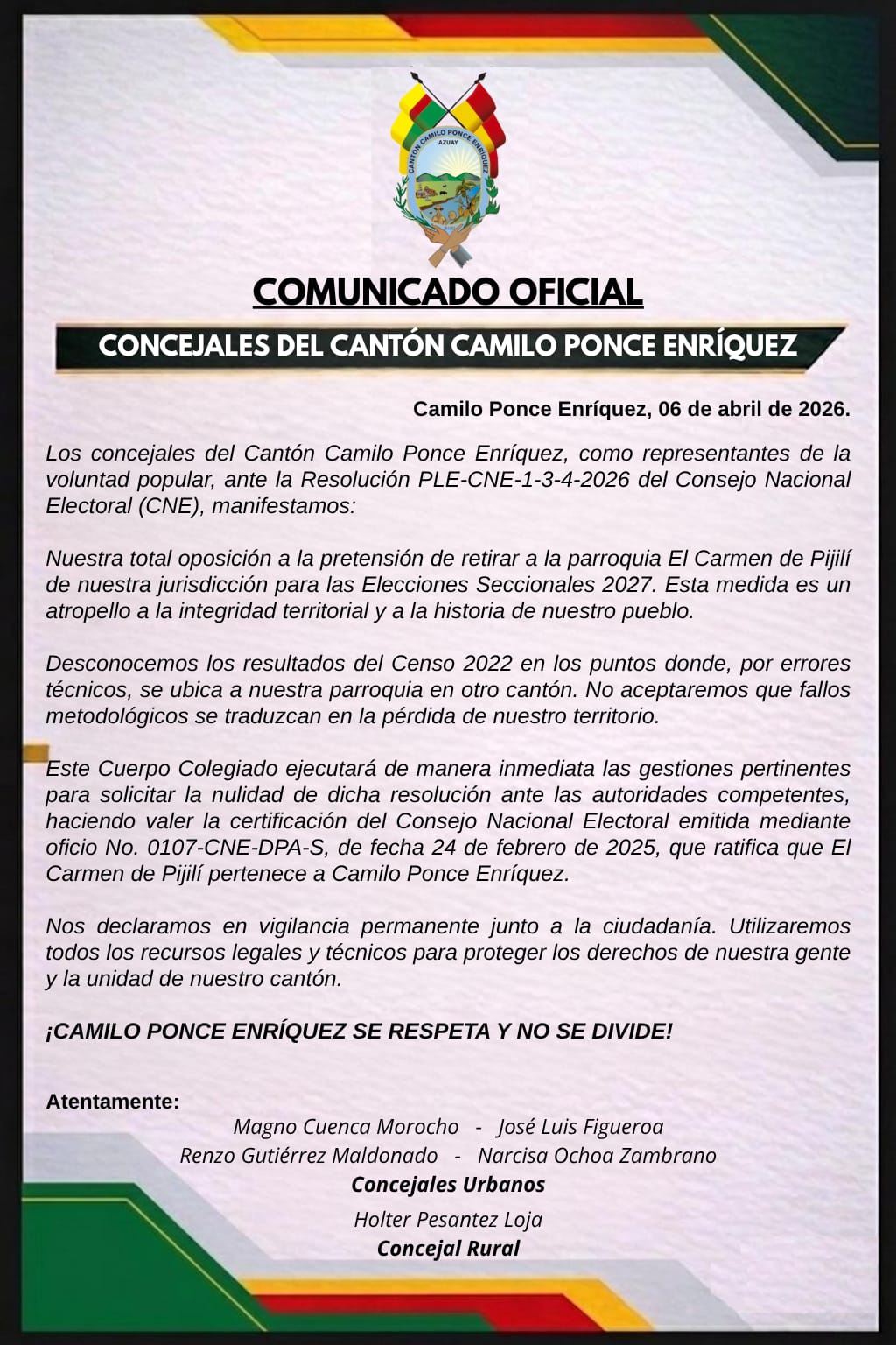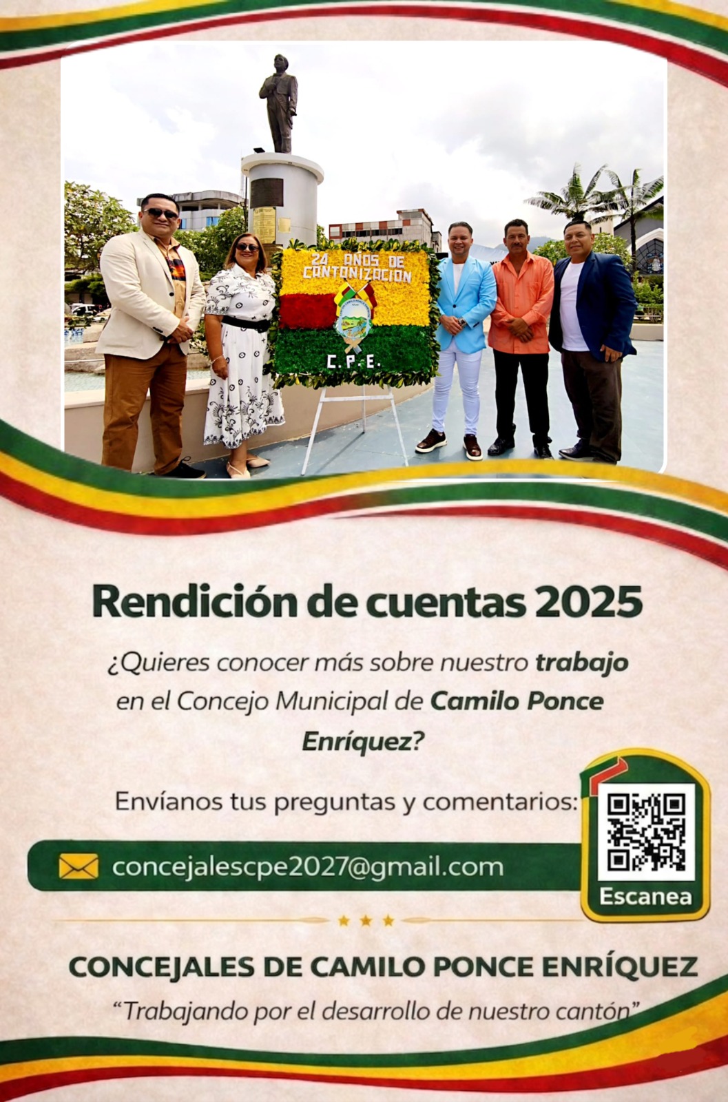 PRESIDENTE DE LA COMISIÓN DE PARTICIPACIÓN CIUDADANADOCUMENTO PRELIMINAR RENDICIÓN DE CUENTAS 2025Credencial Autoridades 2023-2027CUMPLIMIENTO OBLIGACIONES TRIBUTARIAS SRIPLAN DE GOBIERNO |